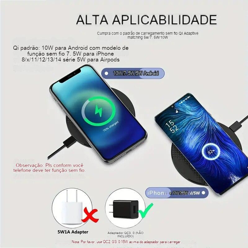 – Mais Seguro e Fácil de Usar: A tecnologia multifuncional exclusiva de proteção inteligente fornece controle de temperatura, proteção contra surtos e prevenção de curto-circuito. Além disso, este carregador sem fio é feito de material ABS resistente ao fogo, garantindo sua segurança. Garantia dupla e segurança dupla proporcionam uma experiência tranquila. Para uma melhor experiência, sugerimos que você remova a capa do telefone e utilize os adaptadores recomendados (NÃO INCLUÍDOS).